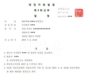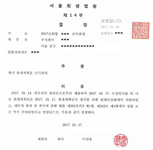 신청과 동시에 포괄적금지명령결정으로 채권자들의 추가적인 압류는 금지됨. 또한 개시결정 후 매출채권에 대한 강제집행을 법원으로부터 취소결정을 받아 모두 정상 수령함. 이후 정상영업으로 모든 채무에 대해 1년간 거치후 10년간 총 30%를 변제하고, 70%는 출자전환으로 채권자들과 협의를 하여 인가결정을 받음. 이후 사업을 계속 유지하여 법률사무소 디에이로부터 법률자문 및 사후관리가 이루어지고 있음