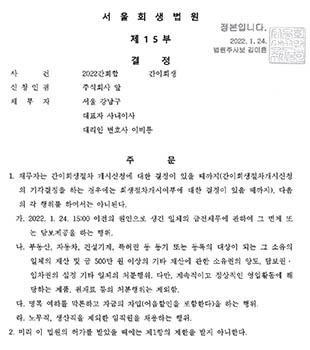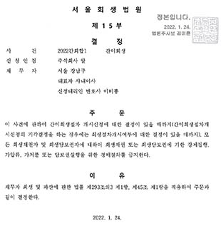 회사를 청산하는 가치보다 회사를 계속 운영하였을 경우의 가치가 월등히 높음을 소명하여 회생신청 및 신청과 동시에 포괄적금지명령결정으로 채권자들의 추가적인 압류가 금지됨. 현재 정상적으로 영업중.